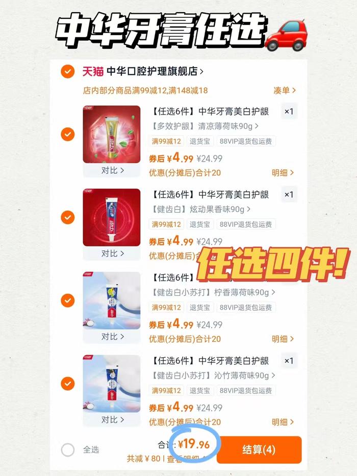 速中华牙膏组合任选 拍4支元19.9 折4.9/支 美白去黄去渍 清新口气 好单发报员 2025年11月25日 20:32 0 举报 速中华牙膏组合任选拍4支元19.9 折4.9/支美白去黄去渍 清新口气https://m.tb.cn/h.SDRds0f复制此消息 打开桃宝查看 复制文案