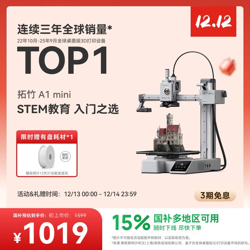 968.15 拓竹A1mini 3D打印机学生新手友好 桌面家用FDM 全自动调平多色高速bambulab A1 mini 单机 好单发报员 2025年12月14日 19:55 0 举报 【968.15】拓竹A1mini 3D打印机学生新手友好 桌面家用FDM 全自动调平多色高速bambulab A1 mini 单机https://u.jd.com/ZOJRmtl 复制文案