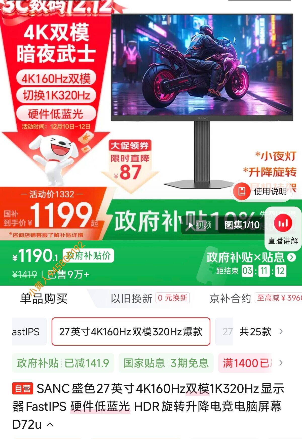 SANC盛色27英寸4K160Hz双模1K320Hz显示器,1190
