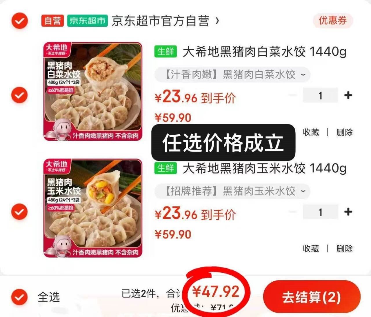 【自营】大希地 黑猪肉水饺1440g