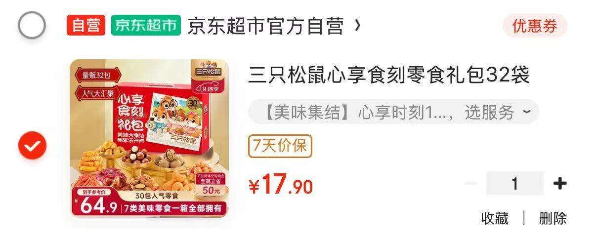 限合肥地区 三只松鼠心享食刻零食礼包32袋1363g 【17.9】
