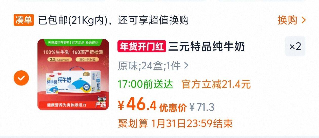 92.8亓1.9亓/盒 三亓特品纯牛奶24盒*2 - 好单发报员 2026年01月08日 09:29 0 举报 92.8亓1.9亓/盒三亓特品纯牛奶24盒*2-1、下拉详情跳转領取59-7券2、自动跳转后 拍2件https://m.tb.cn/h.7Rpx7y5 复制文案