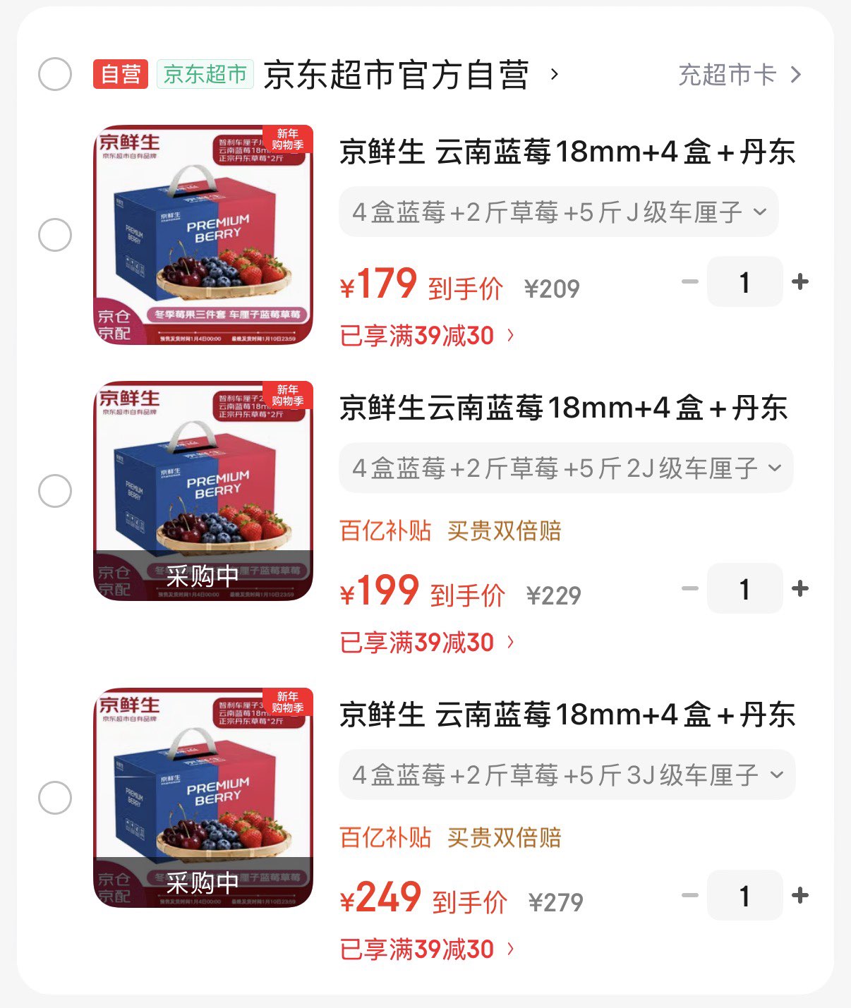 198亓 蓝莓18mm 4盒 丹东草莓2斤 智利车厘子JJ级5斤