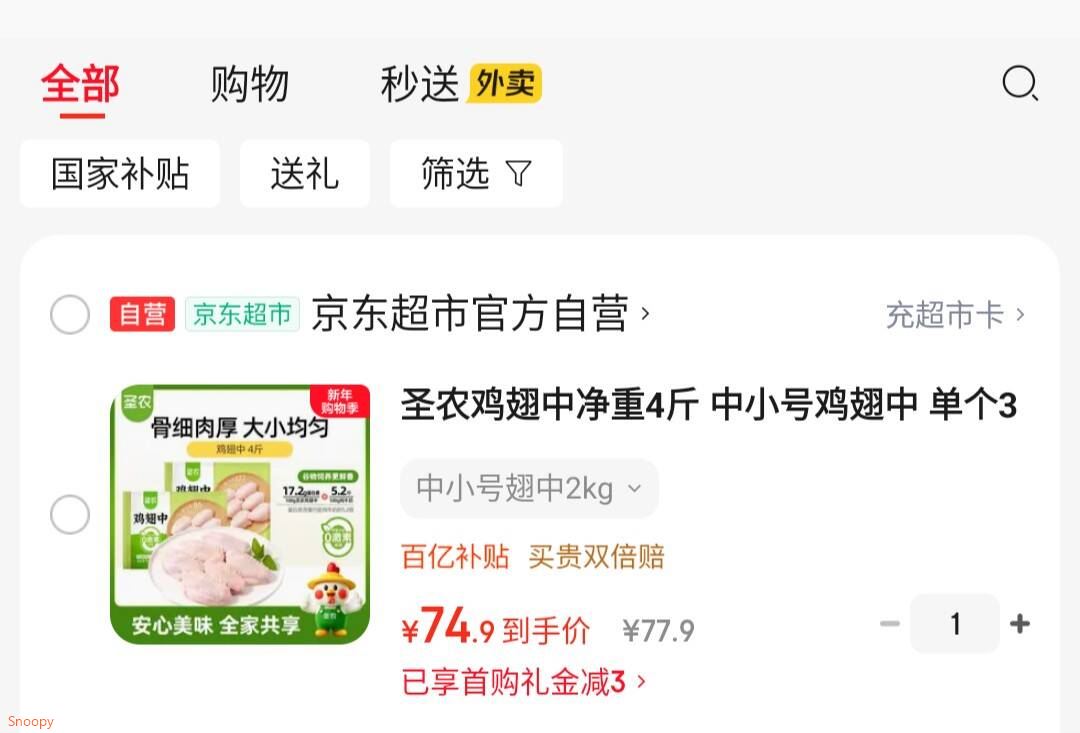 如有3首单,圣农鸡翅中净重4斤 中小号鸡翅中 单个30g-40g 74.9 好单发报员 2026年01月08日 20:21 0 举报 如有3首单,圣农鸡翅中净重4斤 中小号鸡翅中 单个30g-40g【74.9】https://u.jd.com/EDMn65l 复制文案