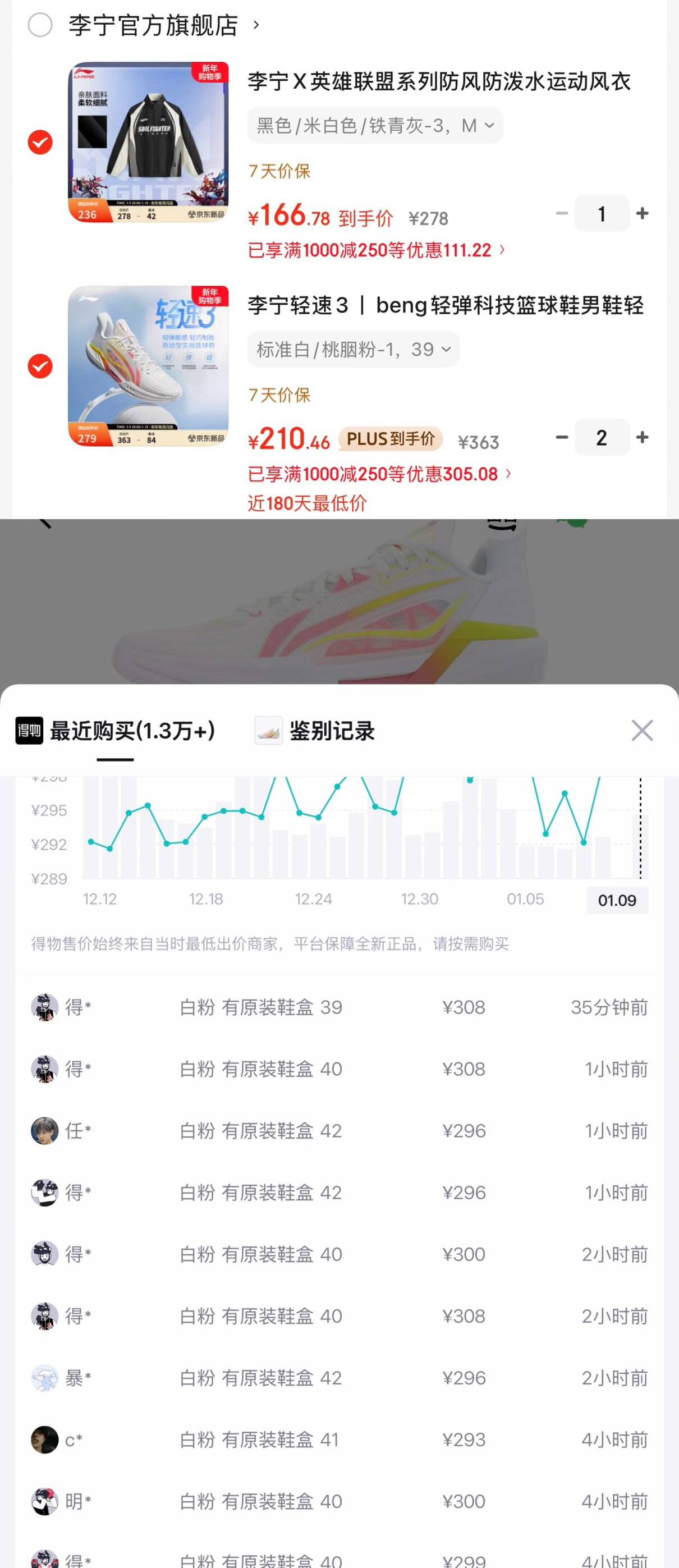 李宁轻速用楼上1000-250卷 购物车210 购物琻197到手 锝.物308 消量不错