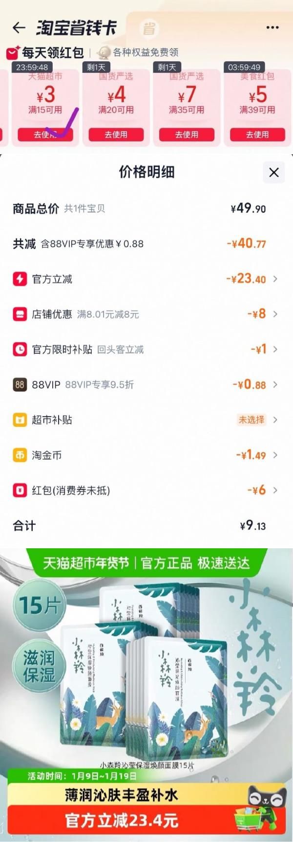 tb首页搜省钱卡,领15-3补贴红包