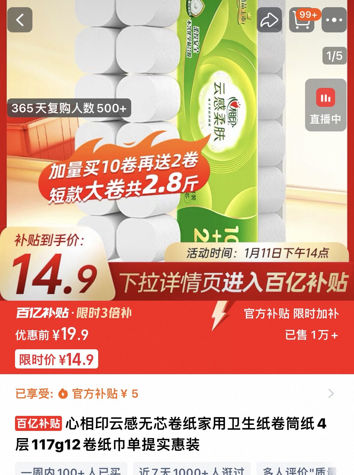 14.9元百亿补贴 心相印 无芯卷纸*12卷 线下超市款!加厚117克款! 好单发报员 2026年01月11日 14:03 0 举报 14.9元百亿补贴【心相印】无芯卷纸*12卷线下超市款!加厚117克款!家用刚需品!有活动就囤呀https://m.tb.cn/h.7Qe0vpO 复制文案