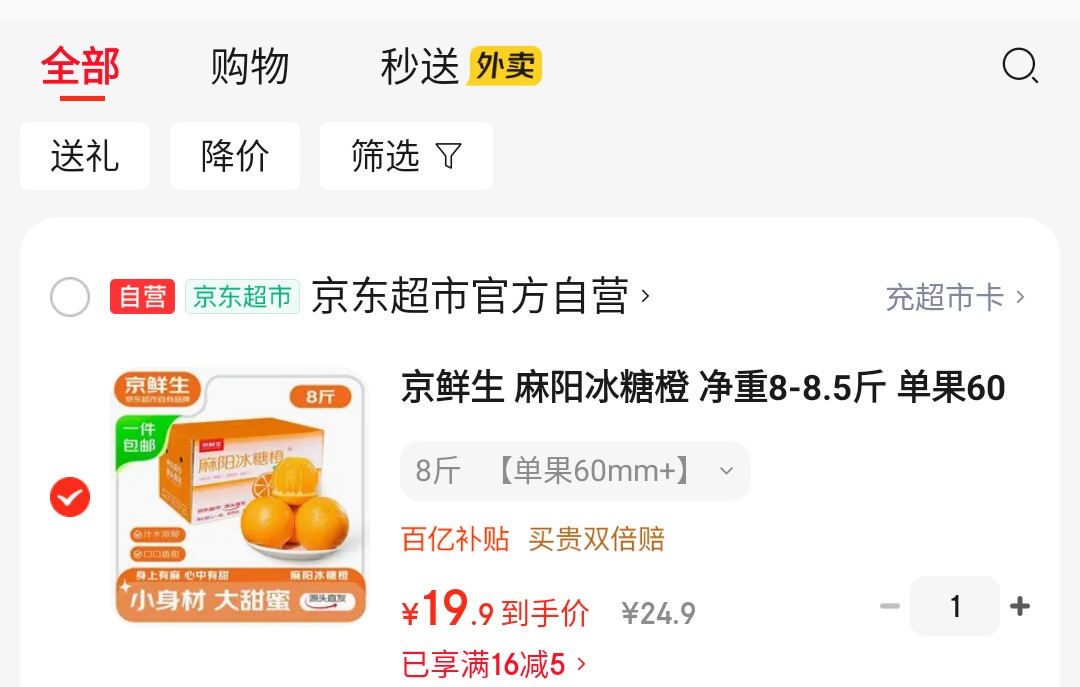 京鲜生 麻阳冰糖橙 净重8斤 单果60mm 【19.8】