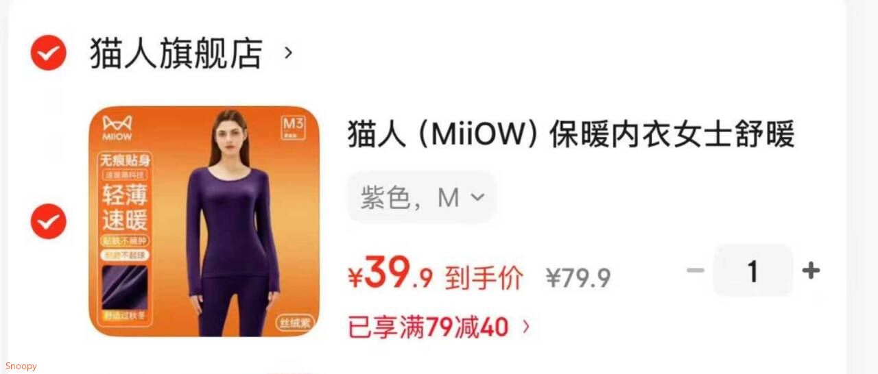 猫人 (MiiOW)保暖内衣女士舒暖绒透气圆领套装【39.9】