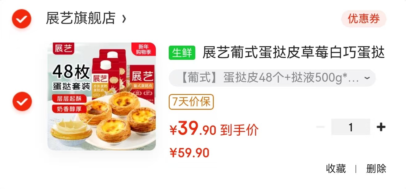展艺 葡式蛋挞皮草莓白巧蛋挞皮 48个 挞液500g*2盒【39.9】