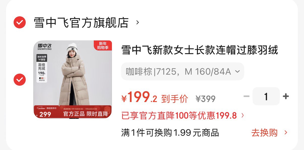 雪中飞长款加厚羽绒服 199亓