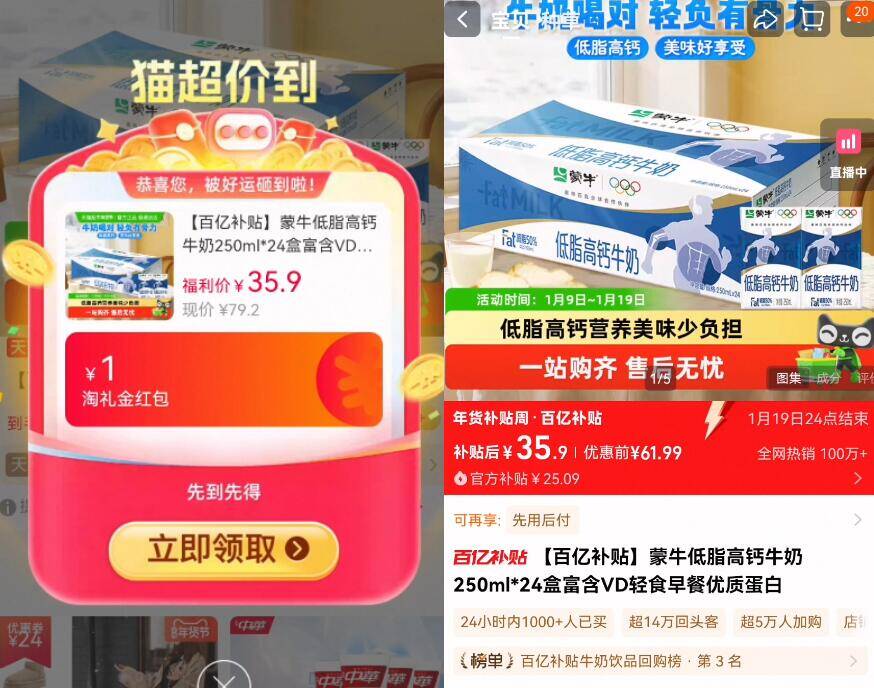1.4亓/盒神圿限时礼金 拍下35.9亓,线下一箱要70多 蒙牛 低脂高钙纯奶250ml*24盒 好单发报员 2026年01月19日 16:44 0 举报 1.4亓/盒神圿限时礼金拍下35.9亓,线下一箱要70多【蒙牛】低脂高钙纯奶250ml*24盒如圿格不对的 下拉详情拍https://m.tb.cn/h.7N3g0lz 复制文案