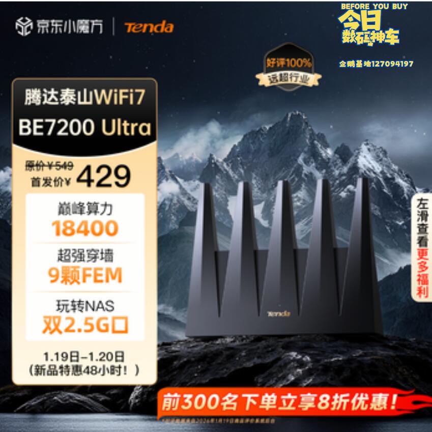 腾达路由器WiFi7 泰山BE7200 Ultra 千兆穿墙王271元 今日到手 271 京东支付付377元,下蛋饭实付价20u.42亓、晒单饭30亓荭包,最终271元详询kf
