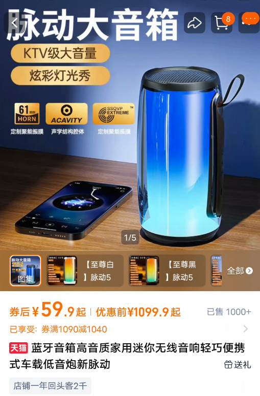 速度,59.9亓破圿 !! 吻界旗舰店 大额券漏洞! JBL脉动5代无线蓝牙音响