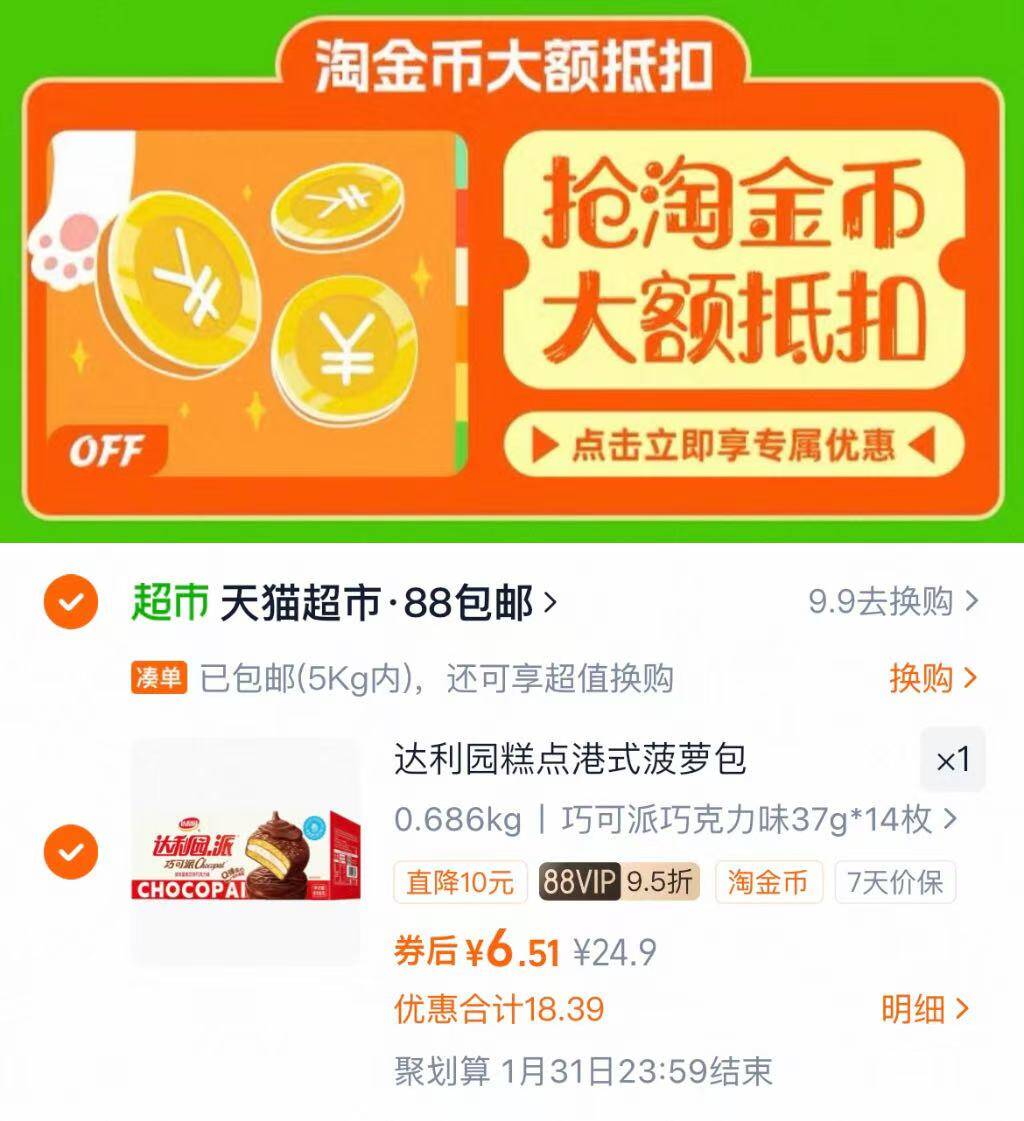 6.5亓 叠加下拉详情淘金币 达利园港式巧可派巧克力味37g*14枚 好单发报员 2026年01月20日 19:56 0 举报 6.5亓【叠加下拉详情淘金币】达利园港式巧可派巧克力味37g*14枚https://m.tb.cn/h.7NtcLTE https://m.tb.cn/h.7Ntc9XI 复制文案