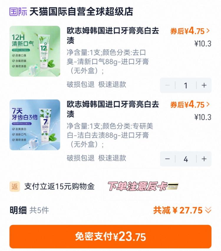 欧志姆酵素美白牙膏1元.7 拍5件饭15购物金,折1.7/支 好单发报员 2026年01月21日 00:01 0 举报 欧志姆酵素美白牙膏1元.7拍5件饭15购物金,折1.7/支https://m.tb.cn/h.7NiqSCi 复制文案
