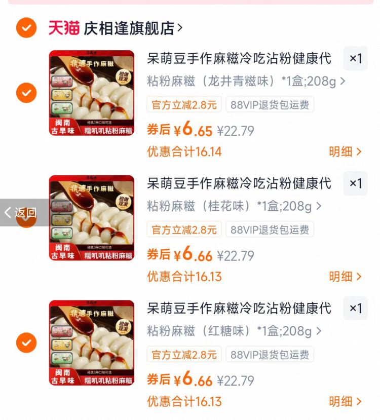庆相逢麻糍208g*3盒19元.9 任选3件拍下成立,折6.6亓/盒 -好单发报员2026年01月24日 21:370举报 庆相逢麻糍208g*3盒19元.9任选3件拍下成立,折6.6亓/盒-口感糯叽叽的,饱腹感挺强当点心/下午茶之类的还不错https://m.tb.cn/h.7L1Wjos复制文案