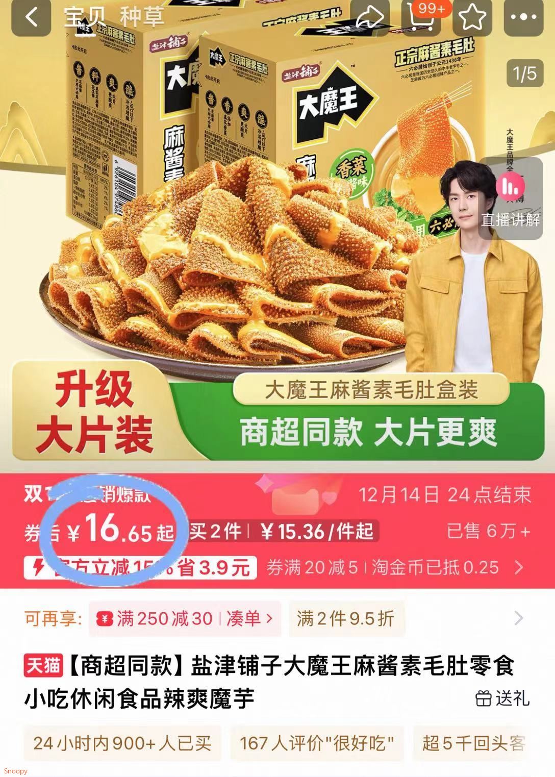 有大水16.9亓 约20包 盐津铺子麻酱素毛肚360g -好单发报员2026年01月25日 19:500举报 有大水16.9亓 约20包盐津铺子麻酱素毛肚360g-每一口都裹满了麻酱 满足https://m.tb.cn/h.7LGokR2复制文案