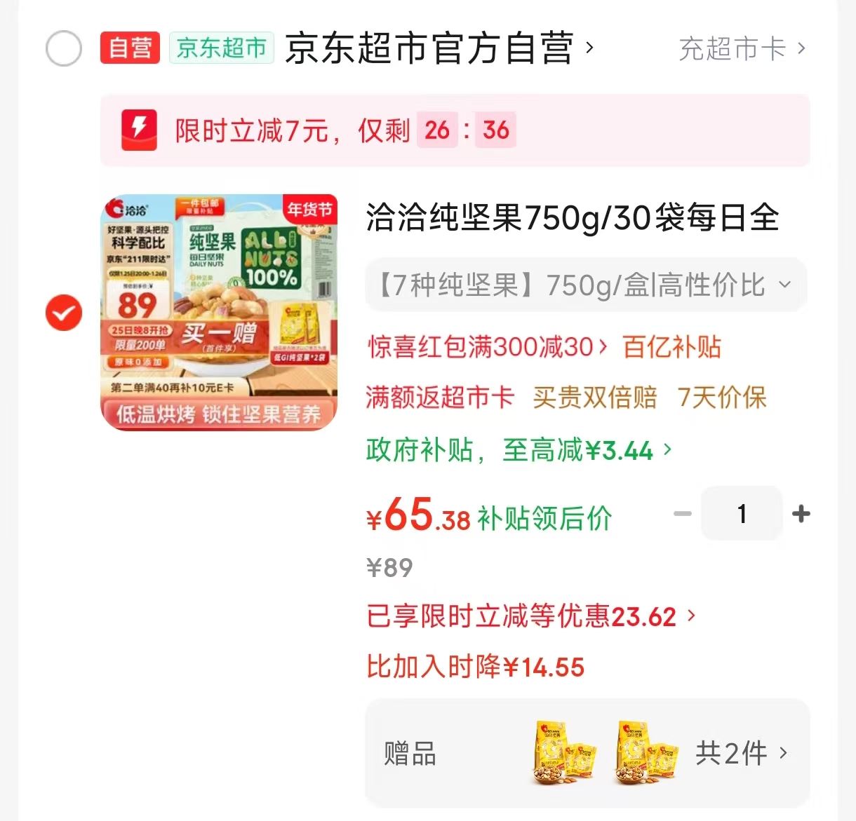 洽洽纯坚果750g/30袋每日全坚果,凑后【65.3】 赠小黄袋坚果100g*2