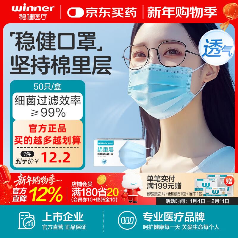 稳健 棉里层外科口罩 50只/盒 拍5件39元,折0.15/只好单发报员2026年01月27日 09:030举报 稳健 棉里层外科口罩 50只/盒https://u.jd.com/JaqVfgH 拍5件39元,折0.15/只复制文案