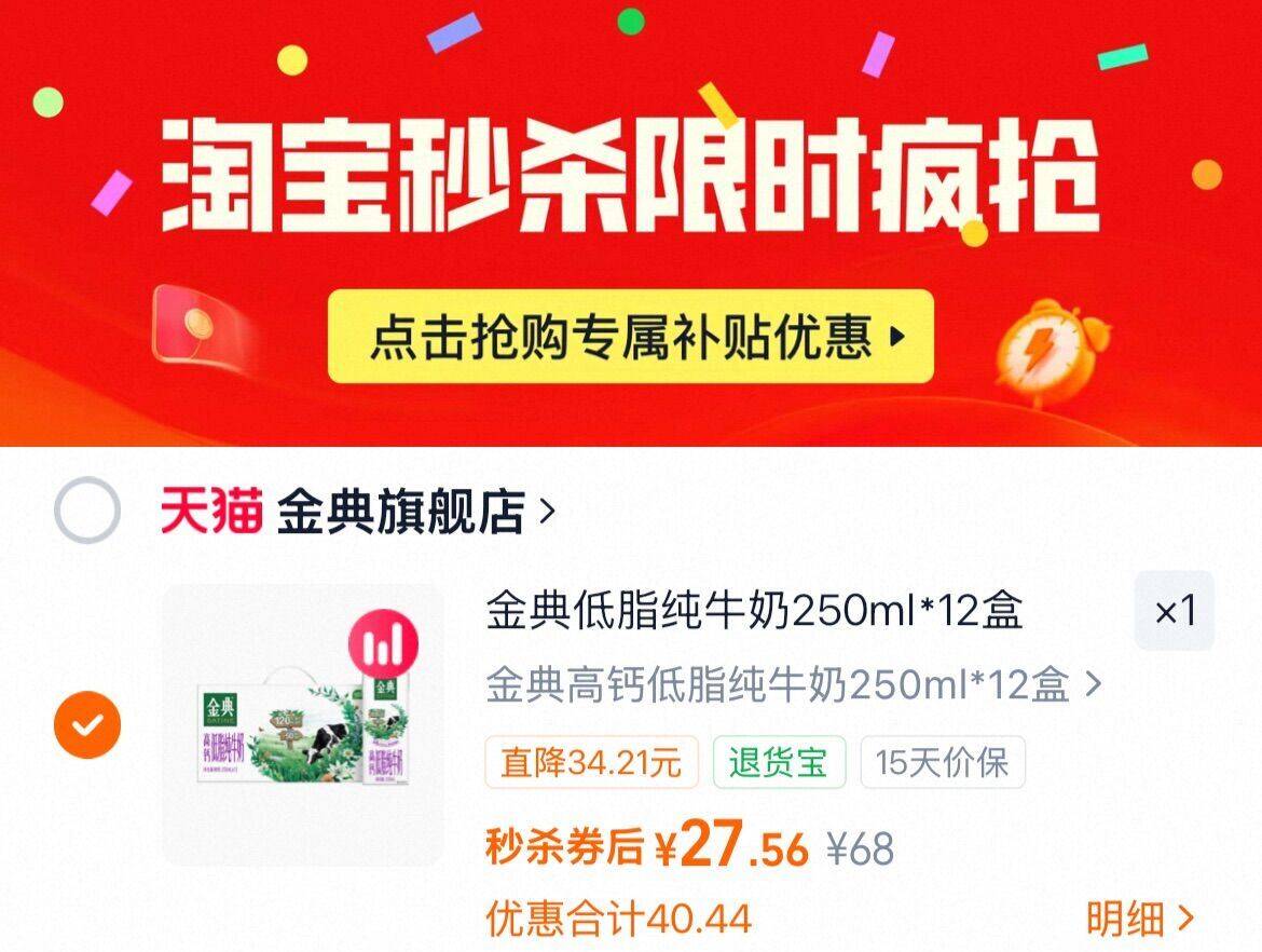 下拉详情拍,27.5亓 金典 高钙低脂纯牛奶250ml*12盒好单发报员2026年01月29日 11:200举报 下拉详情拍,27.5亓金典 高钙低脂纯牛奶250ml*12盒https://m.tb.cn/h.7q5jBWv复制文案