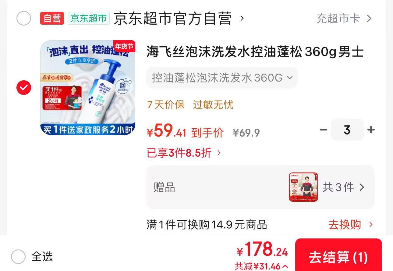 拍3件享受8.5折 拍下178亓 折单件59.4/件 赠JD家政2小时*3件好单发报员2026年01月29日 20:070举报 拍3件享受8.5折拍下178亓 折单件59.4/件赠JD家政2小时*3件海飞丝泡沫洗发水控油蓬松360g*3https://u.jd.com/J1ybJVD 复制文案