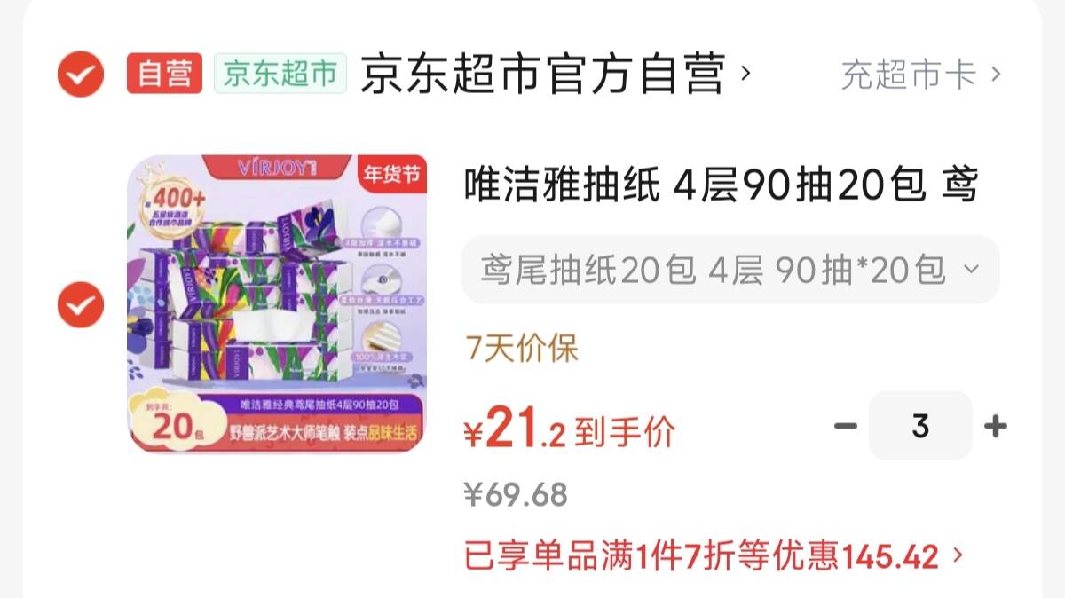 1亓一包唯洁雅鸢尾抽纸 拍3件63.690抽*60包好单发报员2026年01月29日 20:410举报 1亓一包唯洁雅鸢尾抽纸拍3件63.690抽*60包https://u.jd.com/JgyT125复制文案