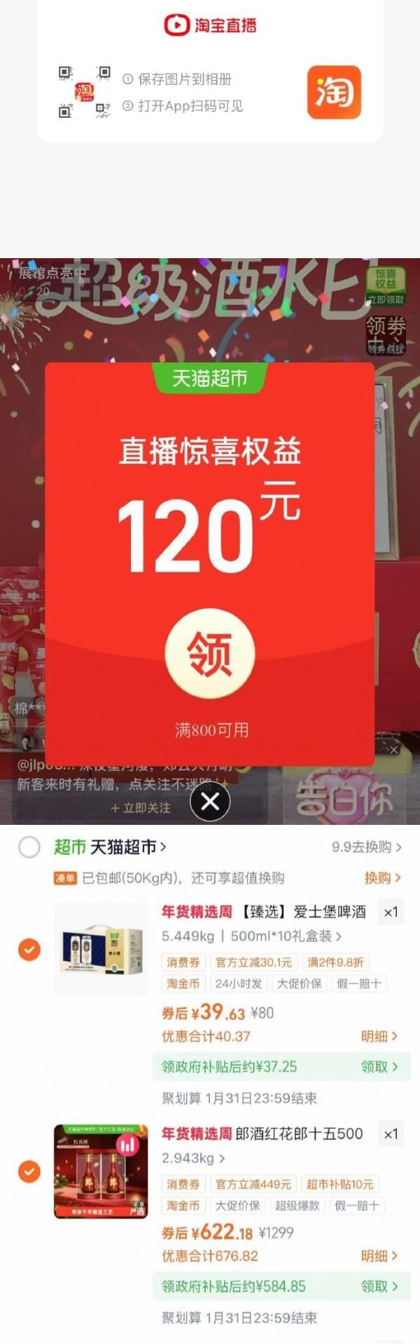 ①扫图一进入直播间,右上角惊喜权益领800-120红包