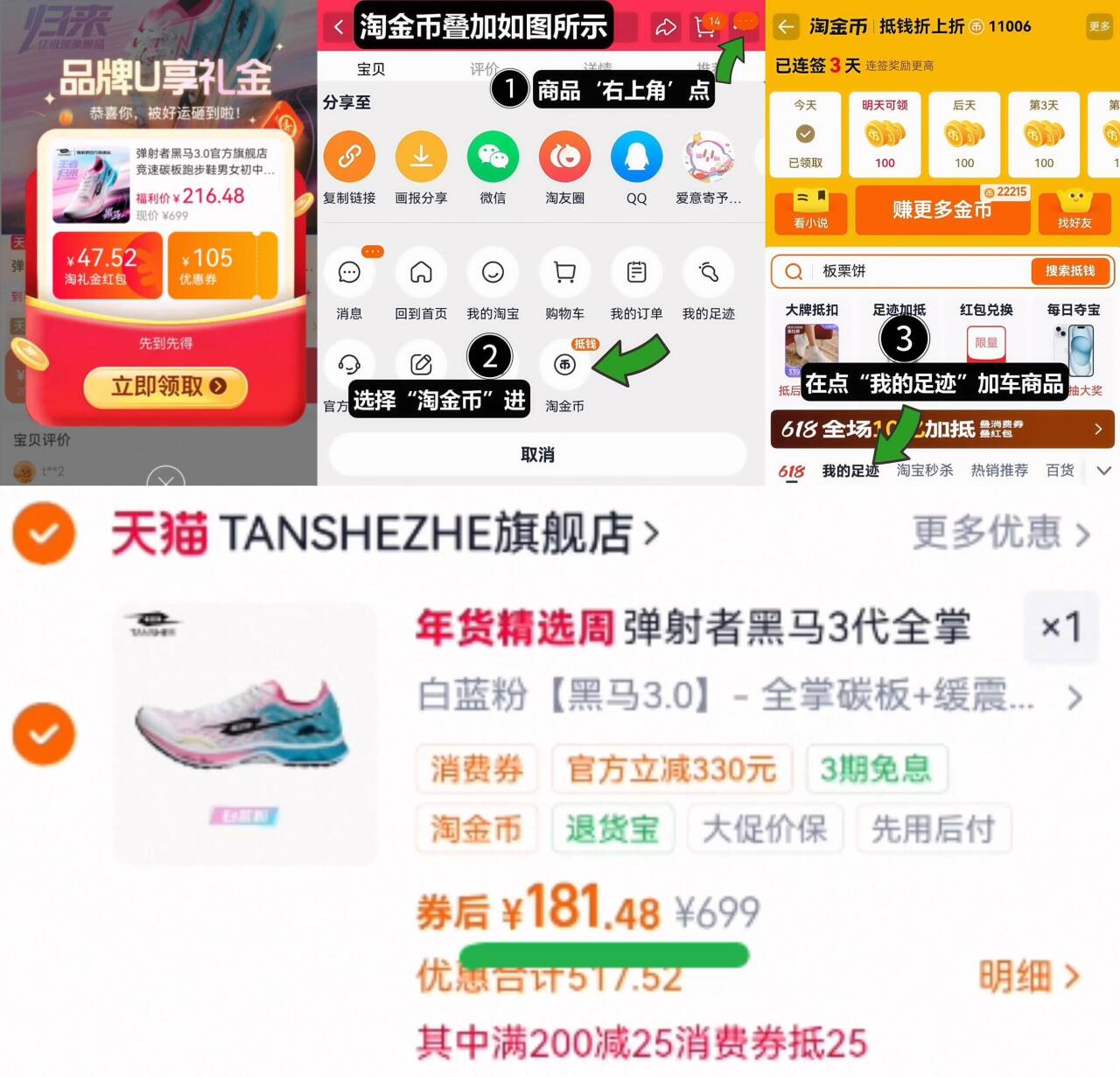 181亓史低叠礼金 10金币 弹射者 黑马3.0跑步鞋 1、需叠88vip200-25消费券好单发报员2026年01月29日 22:080举报 181亓史低叠礼金 10金币【弹射者】黑马3.0跑步鞋1、需叠88vip200-25消费券2、如图点右上角3个点,选淘金币3、选我的足迹-找到商品拍下https://m.tb.cn/h.7rLDzwC复制文案