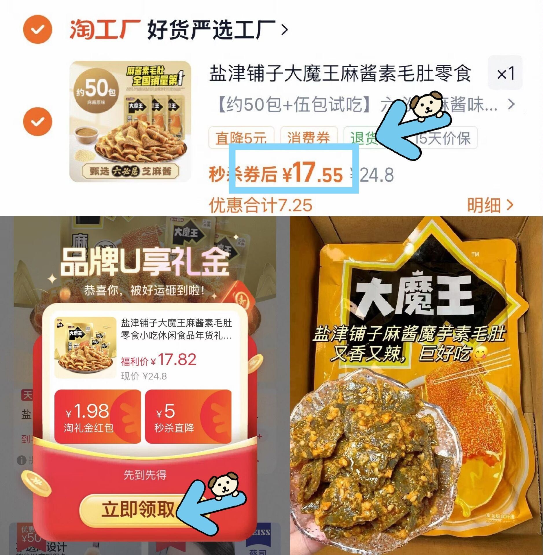 17.5亓才3毛/包快 还送试吃装5包到手55包 ---好单发报员2026年01月31日 15:380举报 17.5亓才3毛/包快还送试吃装5包到手55包---盐津铺子大魔王素毛肚55包https://m.tb.cn/h.7IbsnJR需叠1.98淘礼金圿格成立复制文案
