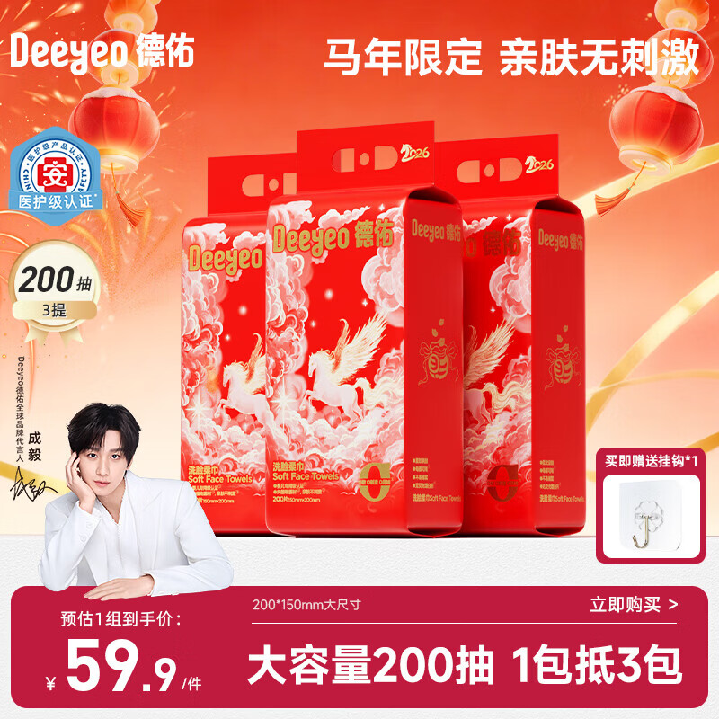 plus43.7元 马年限定悬挂洗脸巾200抽*3提