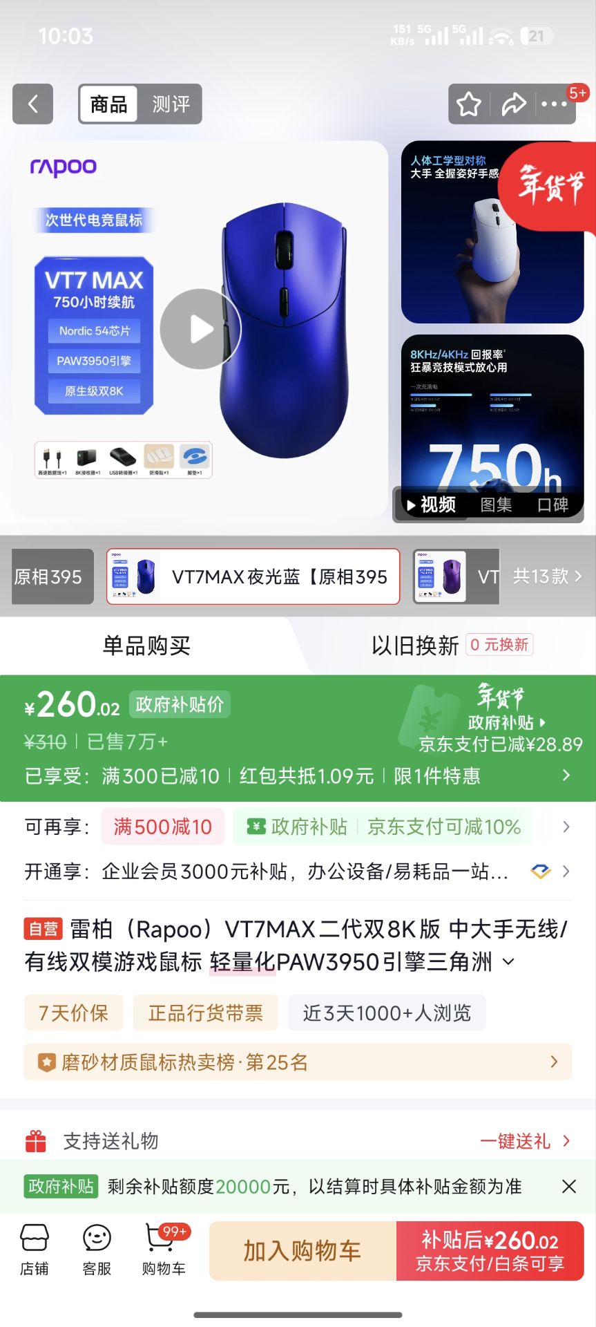 雷柏 VT7MAX二代双8K版 中大手无线鼠标【260】国补