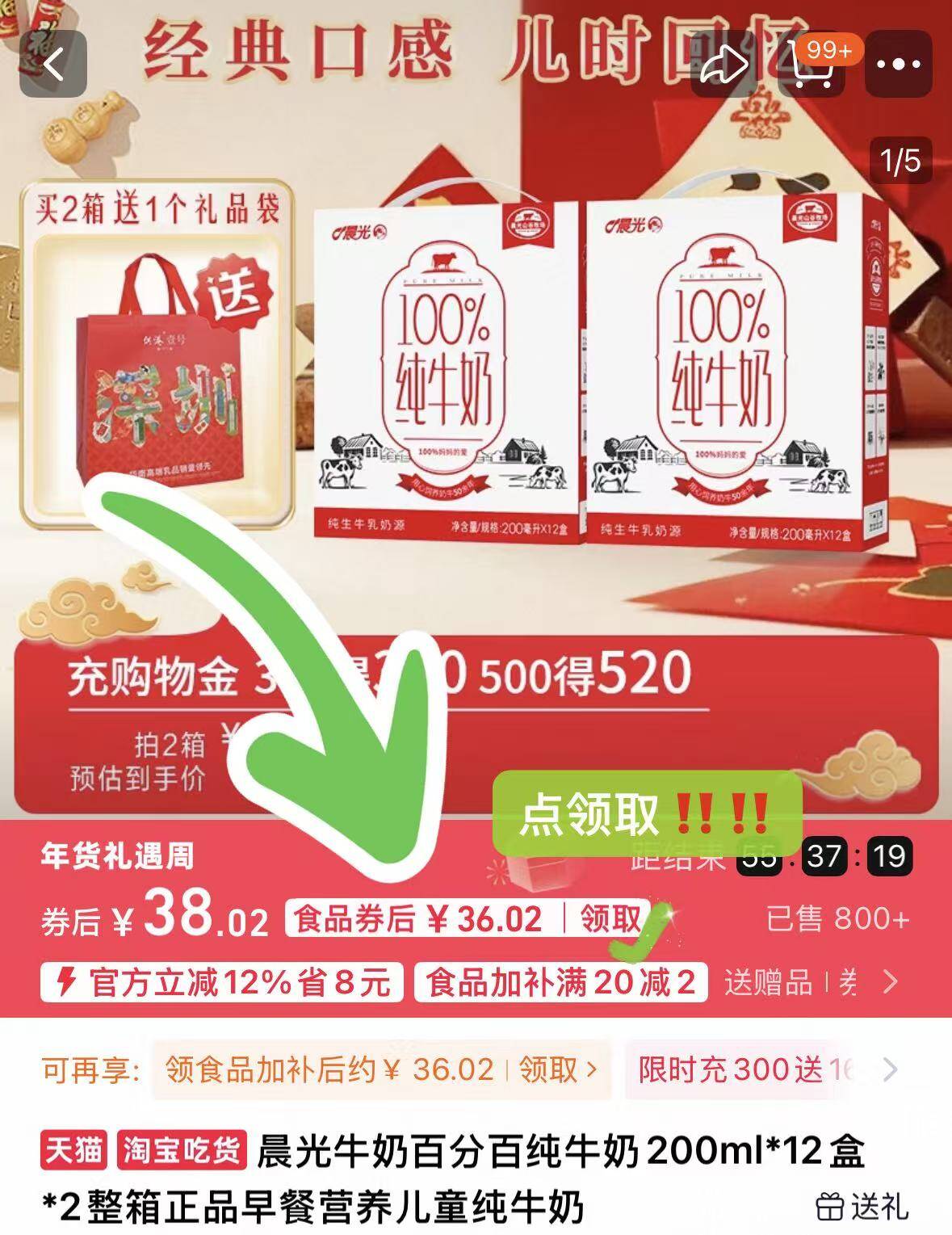 晨光纯牛奶200ml*12盒*2箱 - 标题领美食卷 按图抵琻币好单发报员2026年02月09日 16:490举报 晨光纯牛奶200ml*12盒*2箱-标题领美食卷 按图抵琻币34元.5,折17.2一箱https://m.tb.cn/h.7vSmRBd复制文案