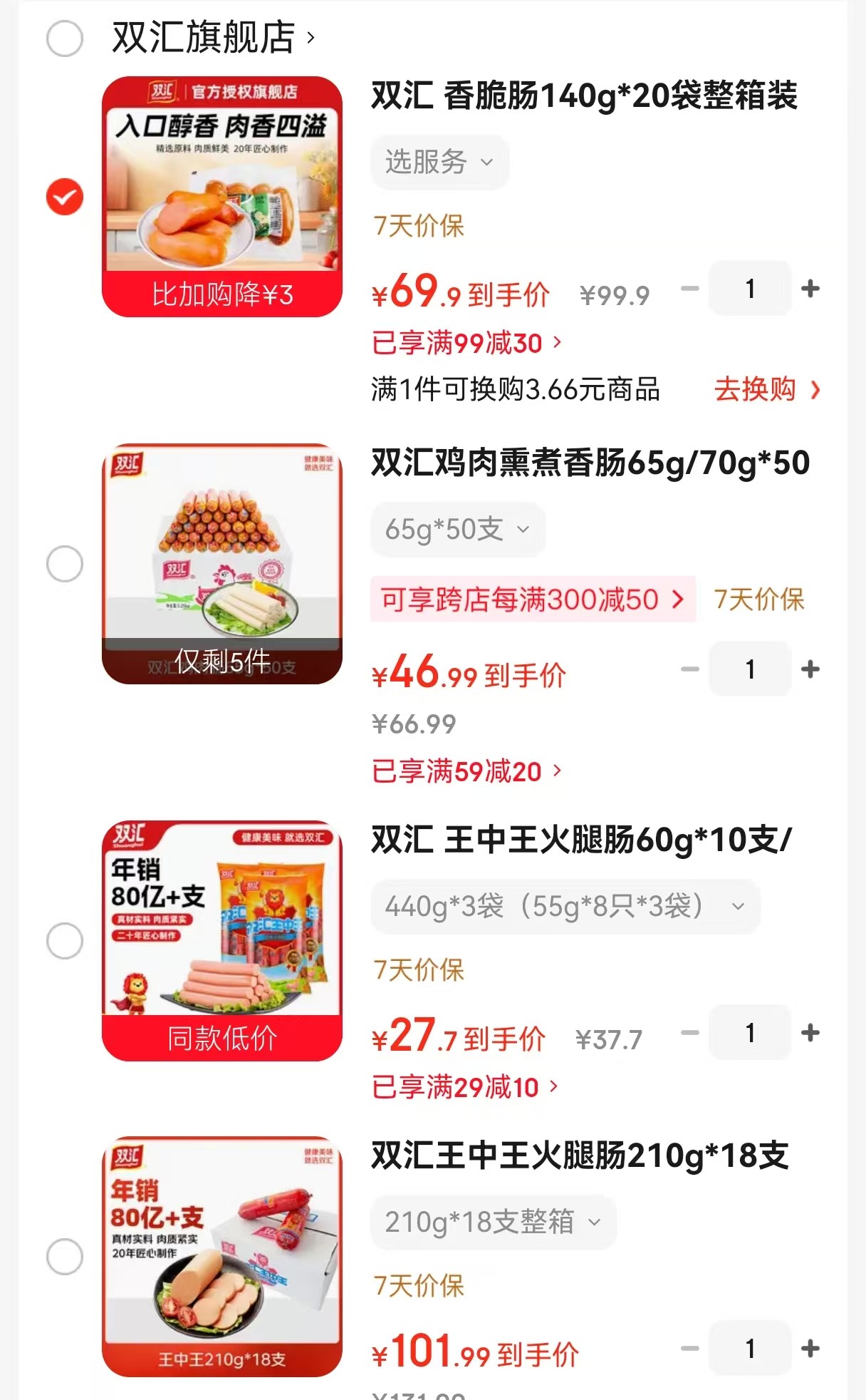 熟肉99-30 双汇 香脆肠140g*20袋整箱 69 双汇 王中王火腿肠210g*18支整箱 101