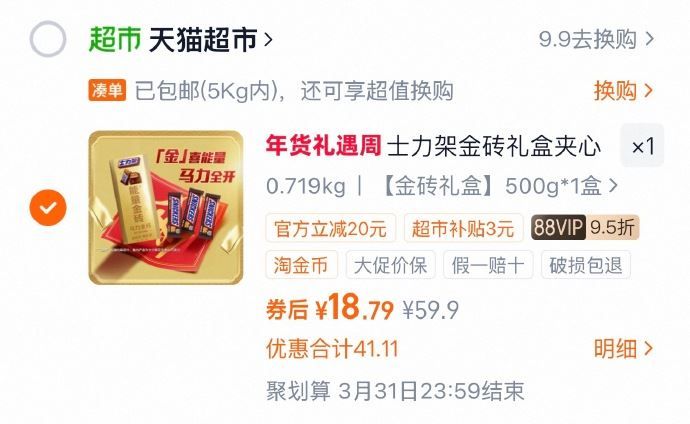 合理凑单用99-10购物券和红包,拍1件vip【18.79】