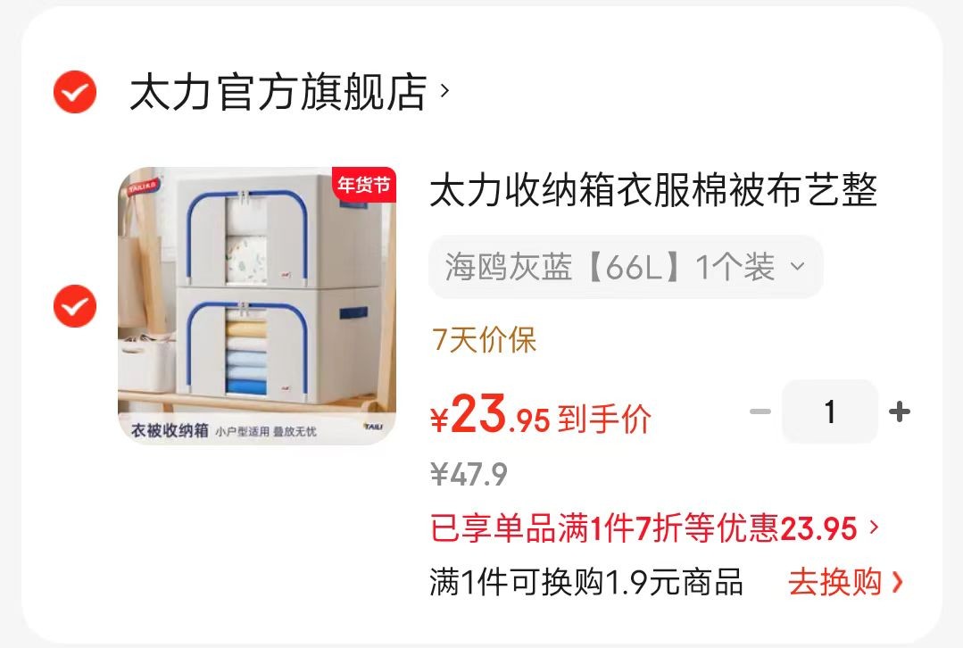 太力 收纳箱衣服棉被布艺整理箱储物百纳箱 66L*1个装【23.9】