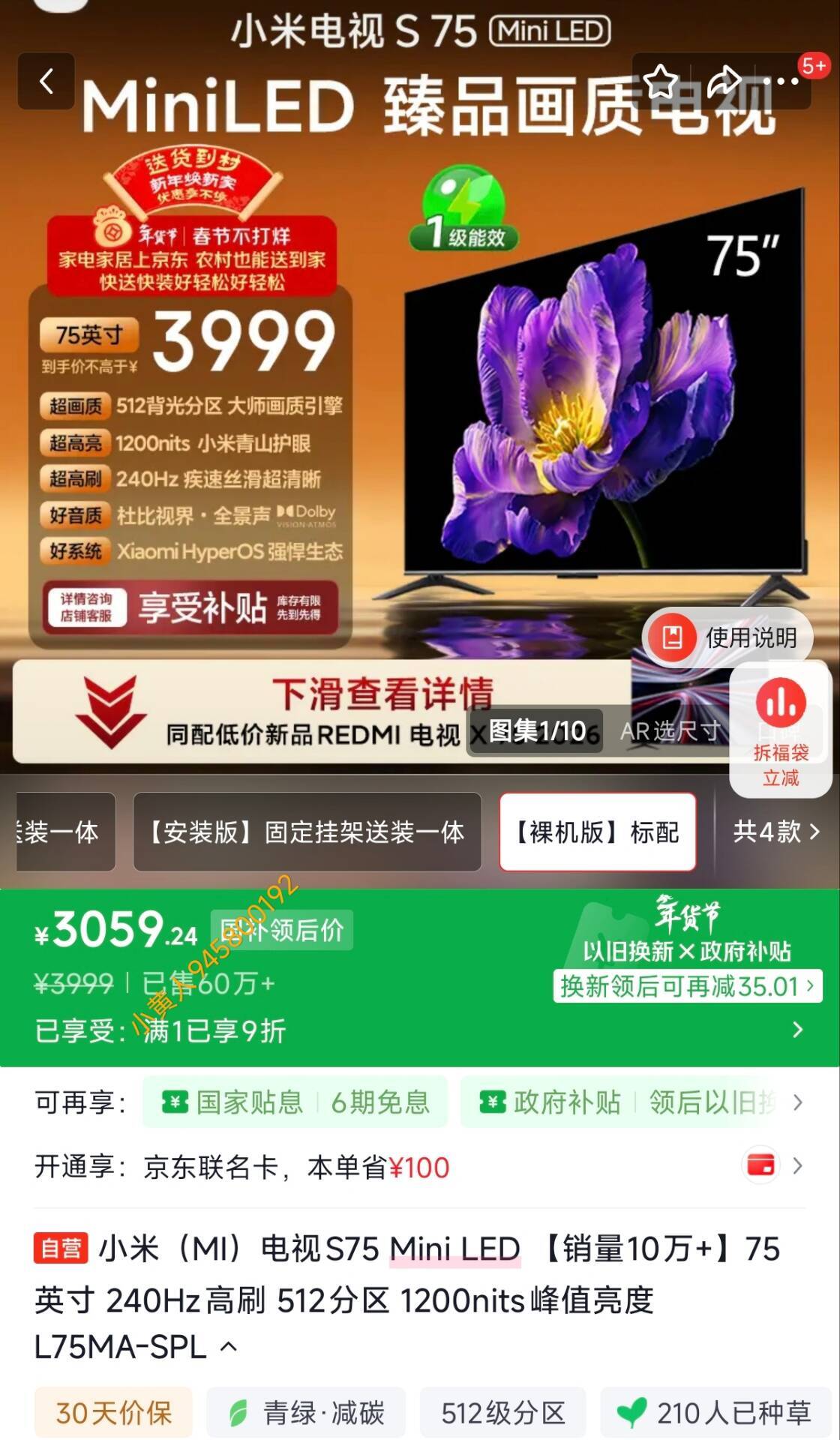 小米电视S75 Mini LED 75英寸 240Hz高刷 512分区 1200nits,部分地区国补3059