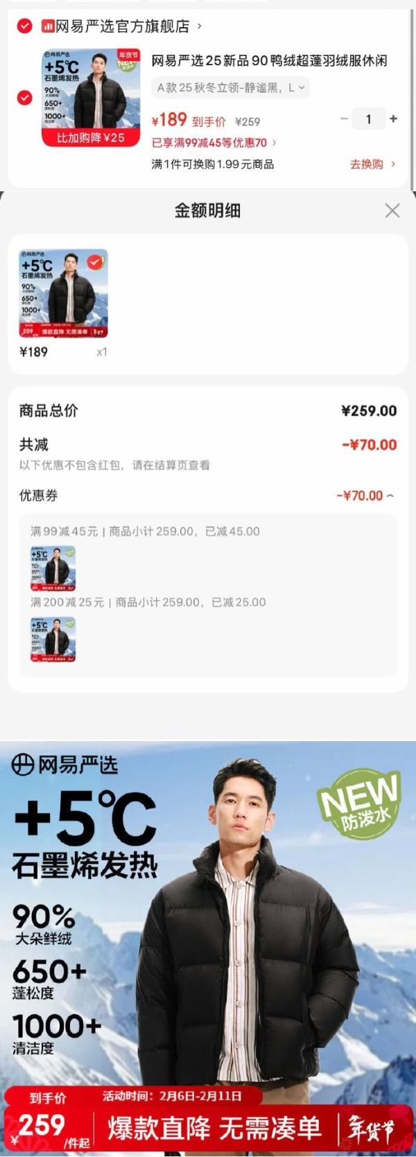 网易严选 90鸭绒超蓬羽绒服,【189】