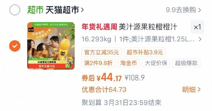 美汁源部分地区有补贴3.9,拍下【44.17】