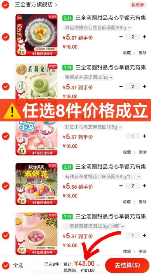 任选8件43元折5.3/件