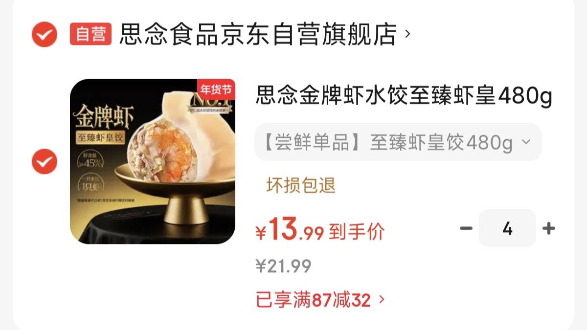 思念金牌虾皇饺480g/32只 拍件55.9元,折13.9一袋 每一个饺子都含一整只大虾 好单发报员 2026年02月10日 17:59 0 举报 思念金牌虾皇饺480g/32只拍件55.9元,折13.9一袋每一个饺子都含一整只大虾https://u.jd.com/l1qMaph 复制文案