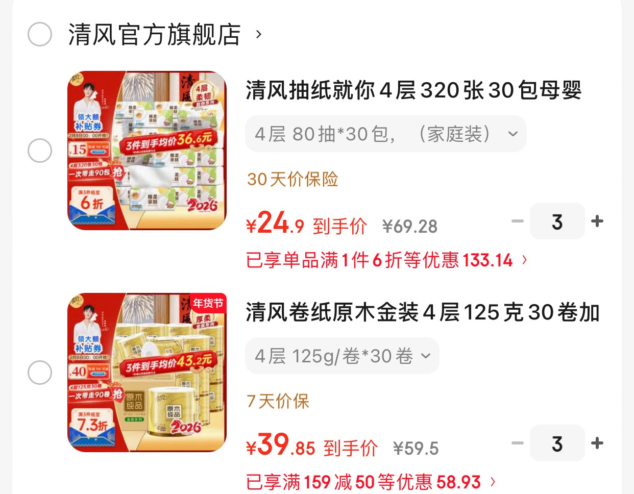 清风 抽纸就你4层320张30包母婴适用,拍3件【74.7】折0.8/包