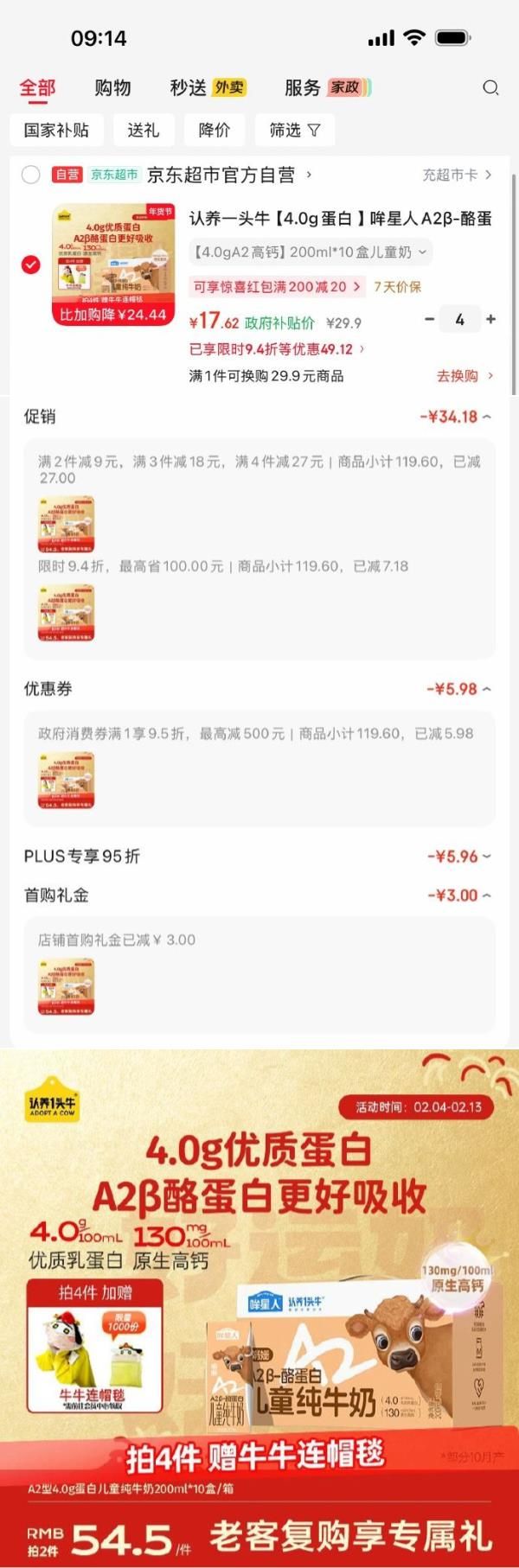 认养一头牛 4.0g蛋白 哞星人A2β-酪蛋白娟姗儿童纯牛奶200ml*10盒,弹9.4立减,3首单