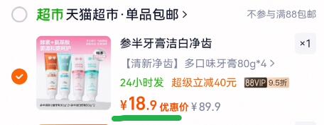 88vip4.7亓/支直接拍 到手18.9亓,带气泡水果味 参半 多口味牙膏80g*4支好单发报员2026年02月11日 09:370举报 88vip4.7亓/支直接拍到手18.9亓,带气泡水果味【参半】多口味牙膏80g*4支https://m.tb.cn/h.7wMHois复制文案