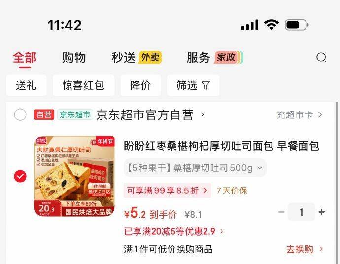 盼盼 红枣桑椹枸杞厚切吐司面包 500g 砸20-5券,凑后 5.2 凑单拍1件好单发报员2026年02月11日 11:430举报 盼盼 红枣桑椹枸杞厚切吐司面包 500g砸20-5券,凑后【5.2】https://u.jd.com/lg8ow1H 凑单拍1件https://u.jd.com/la80j9Q 复制文案