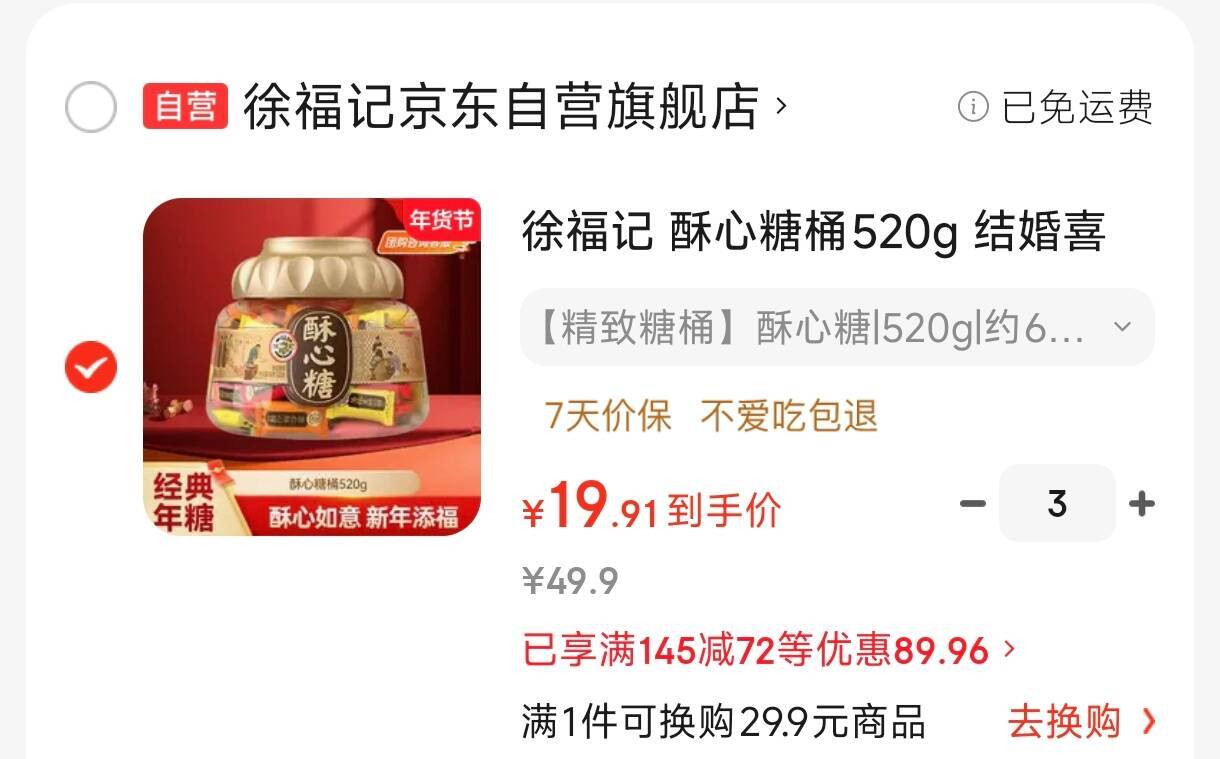 徐福记 酥心糖桶520g 拍件59元.7,才19.9/桶好单发报员2026年02月11日 14:180举报 徐福记 酥心糖桶520g拍件59元.7,才19.9/桶https://u.jd.com/laGDNlw复制文案