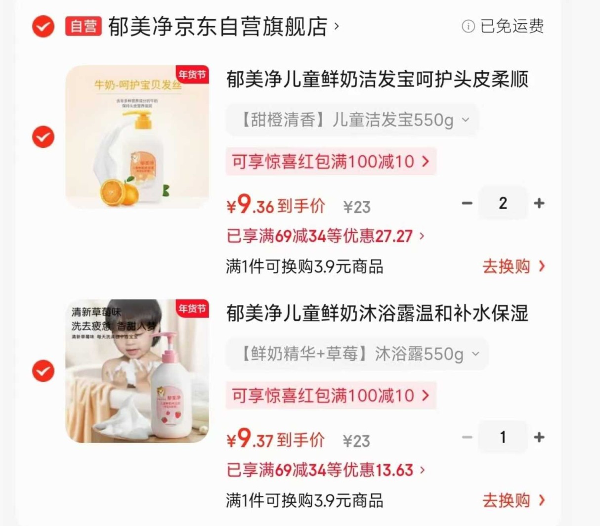 郁美净 儿童鲜奶洗发水/洁发宝/沐浴露 550g,任选3件 折9.3/件