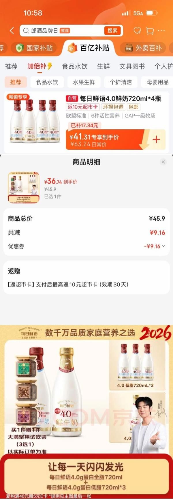每日鲜语 4.0g蛋白720ml*1 4.0g蛋白低脂720ml*3共4瓶,凑后【36.74】返10卡
