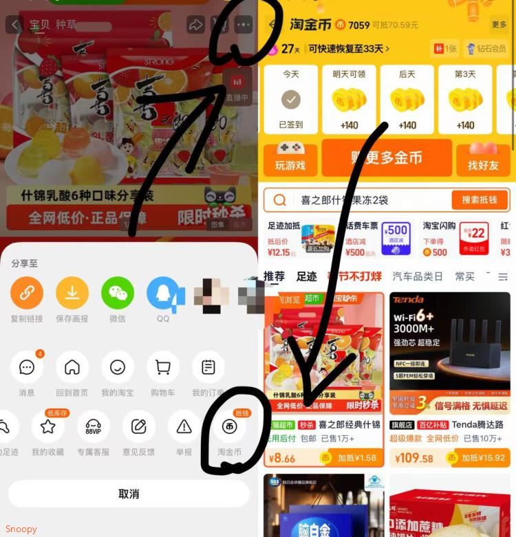 1.商品右上角3个点,选淘金币