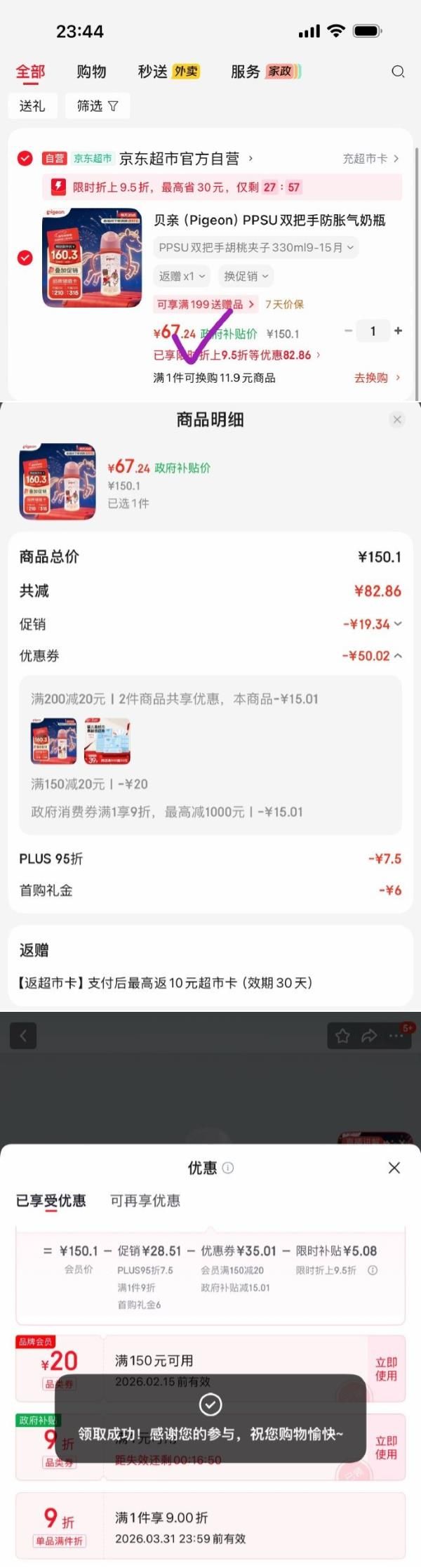 弹9.5折立减,商品下150-20券,6首单